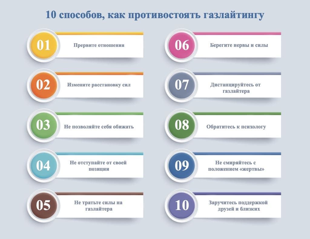 Но если вернуться к более обыденным формам этого явления, встает вопрос: можно ли противостоять газлайтингу? Да, существуют тактики поведения, с помощью которых взрослый человек может противостоять подобному давлению.