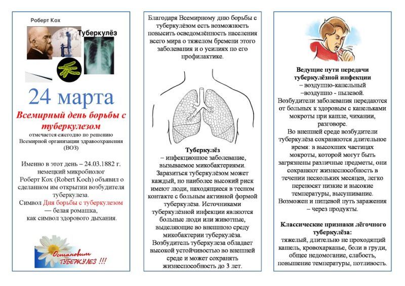 Каждый год 24 марта мы отмечаем Всемирный день борьбы с туберкулезом, цель которого состоит в том, чтобы повысить осведомленность о губительных последствиях туберкулеза для здоровья людей и для общества и информировать об экономических последствиях туберкулеза, и таким образом активизировать усилия по борьбе с глобальной эпидемией этой болезни. В этот день в 1882 г. д-р Роберт Кох объявил, что ему удалось открыть бактерию-возбудитель туберкулеза, благодаря чему стали возможны диагностика и лечение этого заболевания.