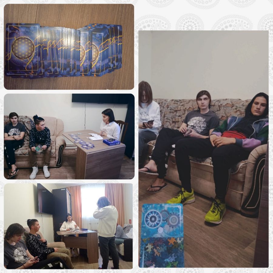 В нашей сессии МАК мы с ребятами прошли несколько этапов работы с запросами к картам. Работа с МАК выстраивается в несколько этапов: распознавание теневой стороны психики (исследование слабых сторон личности, препятствий), возможности и ресурсы (понимание свои сильных сторон и действий на пути разрешения конфликтов и препятствий), вопрос к картам по решению или выходу из проблемы. Карты и ассоциации которые они вызывают, открывают в личности ребят новые грани, помогают увидеть и проговорить теневые стороны личности, указывают нам на наши слабые стороны, раскрывают новые источники внутренней силы и указывают на ресурсы, которые нам помогут на пути к достижению цели или получение ответа на запрос. С помощью психолога, участники занятия имеют возможность получить обратную связь и ответы на свои вопросы. В ходе терапии МАК, ребята учились формировать внутренний запрос для работы с психологом, в процессе увлекательной психотерапевтической игры, развивается ассоциативное и метафорическое мышление, активируется творческий потенциал, ребята учатся рефлексивности и умению выражать свои мысли на серьзные темы.